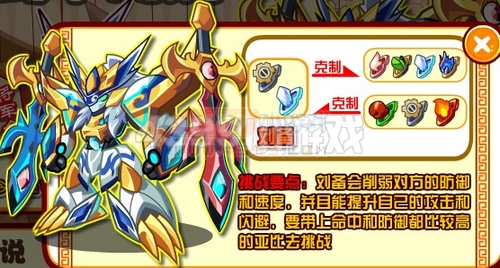 刘备会削弱对方的防御和速度,并且能提升自己的攻击和闪避,所以建议玩家要带上命中和防御都比较高的亚比去挑战!