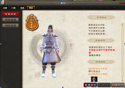 1. 当一个帮会占领一个场景的全部两块帮会地盘后,该帮会帮主即可获得该场景对应圣主身份,而且还会获得对应圣主称号;