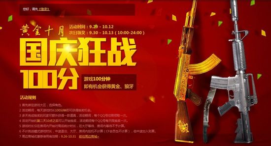 中秋国庆马上就要到来了,CF为玩家们也献上了节日大礼,国庆狂战100分活动震撼上线。玩家们只需在线100分钟就能获得丰富礼品哦,下面就一起来看看吧!