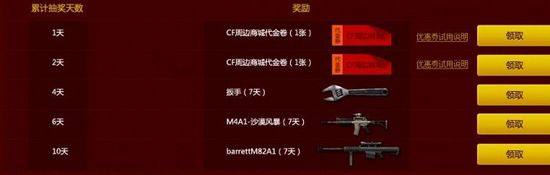 前两天完成任务可以领取CF周边商城代金券,连续4天完成任务可以领取扳手。连续6天完成任务,可以领取M4A1沙漠风暴,连续10天完成任务更可领取终极武器barrettM82A1。