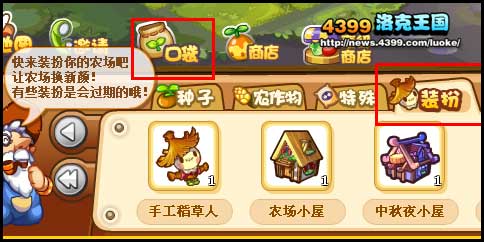 2012年9月28日更新后,小洛克们进入自己的农场,就可以看到有一个礼包。在礼包里会赠送4件中秋装扮,其中就包括中秋宣传板。