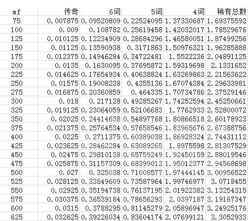 首先依照上述数据和假设,计算了下每组精英的传奇,6词稀有,5词稀有,4词稀有的平均掉落件数(考虑叠满5层勇气,无勇气的farm效率将大幅下降。