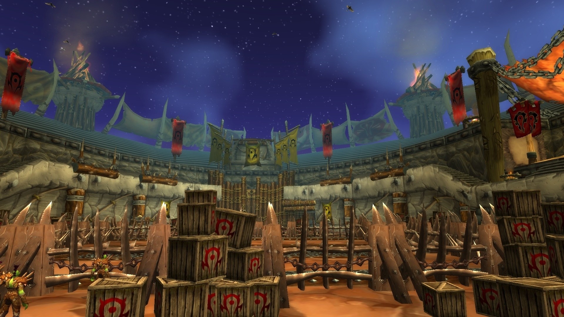 搏击俱乐部的场地类似古罗马竞技场,玩家和怪物将在中间的圆型区域中搏斗,而四周看台上坐满观众。部落方的搏击场地位于奥格瑞玛荣誉谷,像血环竞技场一样,各种木钉装饰和圆形的场地,典型的奥格瑞玛兽人风格: