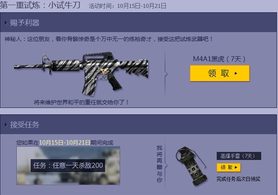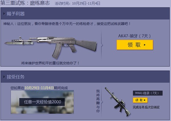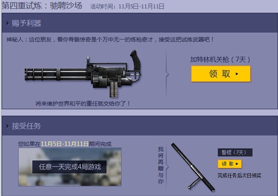 在活动期间,官方会随机挑选一批玩家派发试炼任务,并赠送试炼武器; 所有被选中的玩家在任务期间完成试炼任务可于次日10:00-24:00领取道具奖励; 试炼任务共有四期,每个QQ号码每期任务只能完成一次; 玩家可在页面查询试炼资格。