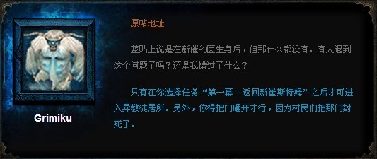 暗黑3异教徒居所怎么进入呢?最近,有玩家询问什么找不到异教徒居所进入炼狱装置,后来雪人叔叔Grimiku 说,玩家只有必须选择任务“第一幕-返回新崔斯特姆”之后才能进入异教徒居所。