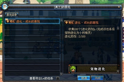 当树精宠物达到LV10时,在奥兰奶奶处接受任务“成长的喜悦”该任务需要进化药剂100个。
