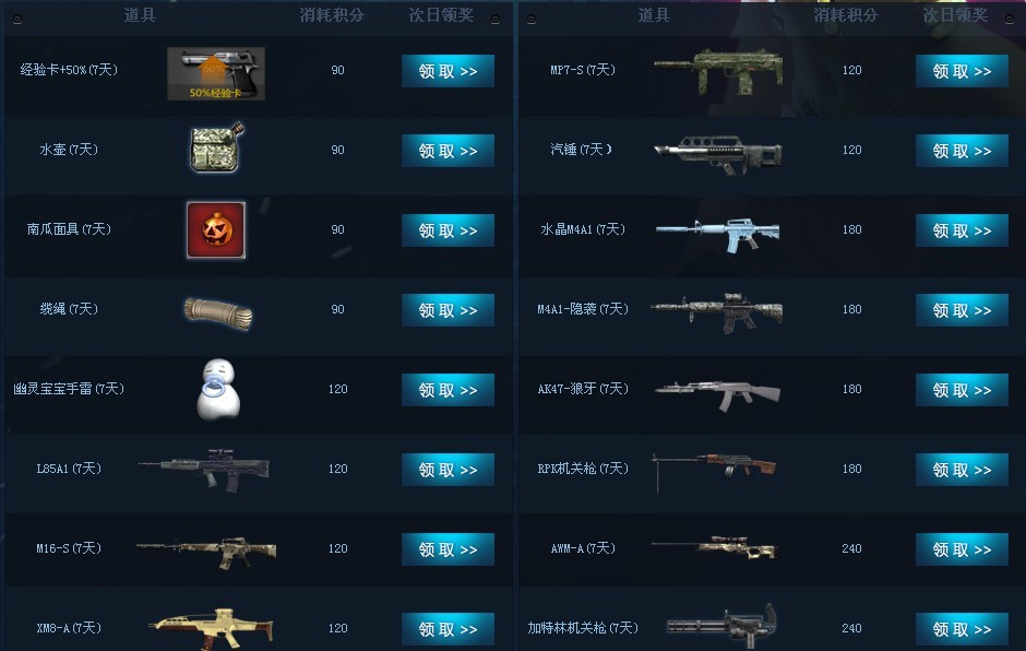 玩家如果在QQ网吧内游戏,次日根据游戏时长获得积分,可兑换以下道具。