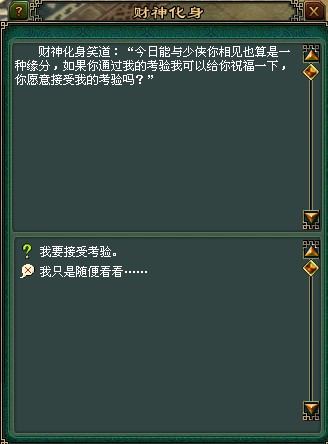 2.玩家找到NPC之后可以接受财神化身或福神化身的考验。