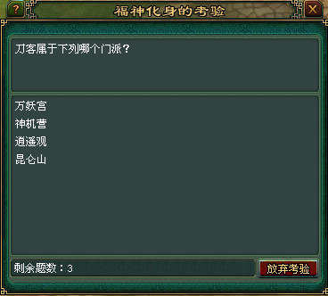 3.财神和福神的考验有3道题目,玩家需要连续答对3道题目才能通过考验,如果答错了则重新给出3道题目。