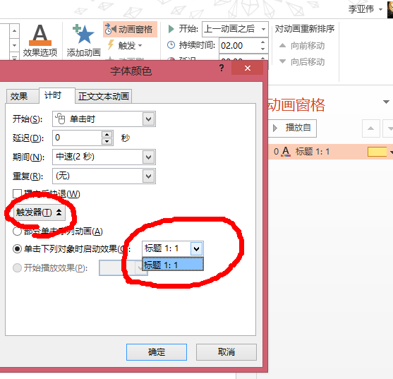 然后计时选项选择触发器,触发对象为超链接本身,就是文本框/标题本身。