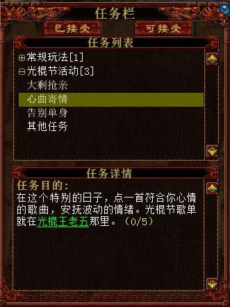 光棍节,光棍王老五独自站在长安桥头,心里好苦啊,如果你能点一首符合他心境的歌曲,那么他会给予你一些经验奖励哦~