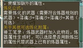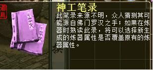 在炼器时,可以加入神工笔录,炼器结束时,可以自行选择是否保留新出的炼器的属性,同时消耗一本神工笔录。