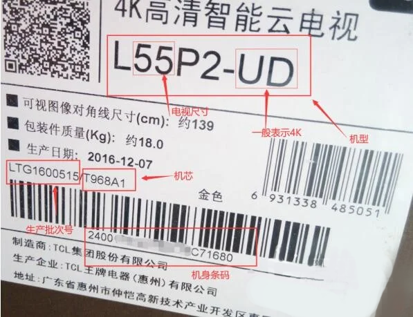 每个电视都有一个电视型号如L43E6800 L代表是LCD LED电视,43代表液晶显示屏是43英寸,有的电视带有UD 一般UD代表是4K超高清电视!