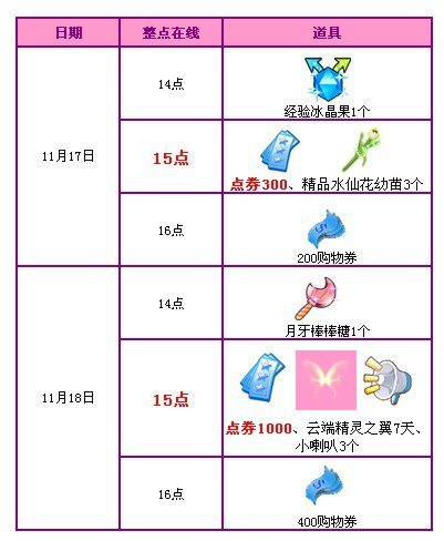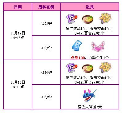 11月17日指定时间累积在线90分钟即可获得100点券。