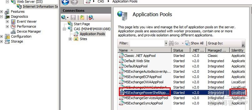 我这里通过将MSExchangePowerShellApp的Identity由"ApplicationPoolIdentity"改为“LocalSystem”后(如上图),EMC和EMS可以正常打开了!