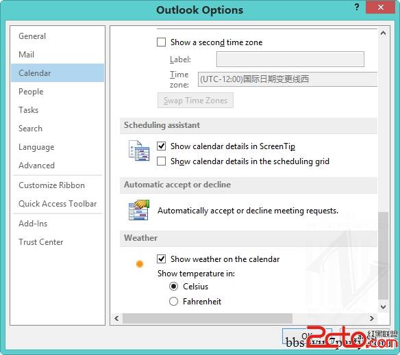 我们依次按下alt--f--t打开Outlook Options,选择左边的日历(Calender),右侧滚动条托到最下方,看到Weather,单选框选择℃标记的(Celsius)即可。