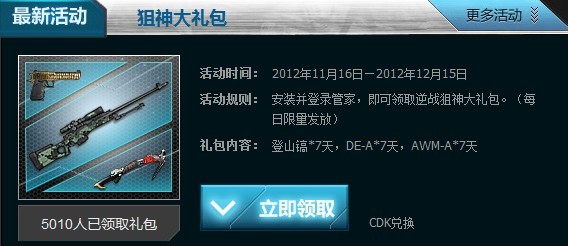 逆战最新QQ管家礼包新鲜出炉啦,从现在起大家只要安装并登录QQ管家,就可领取逆战狙神大礼包,礼包里面包括登山镐*7天,DE-A*7天,AWM-A*7天!