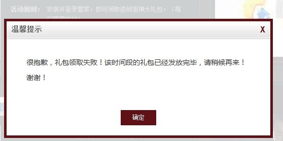 于是小编也赶紧去领取了,结果很悲催,礼包领取失败,系统提示说是该时间段的礼包以及发放完毕,我勒了个去!