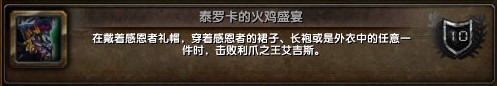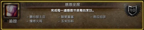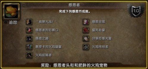 感恩节,和其他节日成就不同的是,在这个节日里你可以尽情享受烹饪美食的乐趣,要记得多做善事!完成所有的感恩节任务可以获得"旅人"头衔,另外还会获得火鸡笼,可以召唤非战斗宠物肥胖的火鸡。