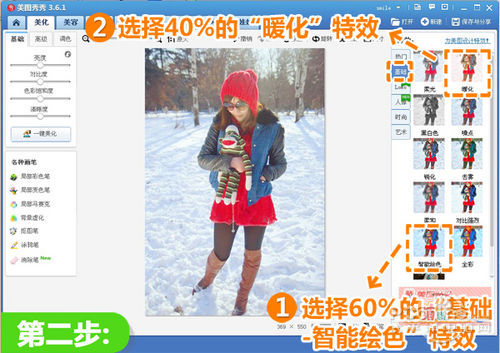 2、再选择透明度为60%的“基础-智能绘色”特效和40%的“暖化”特效,提升一下图片的色彩感。
