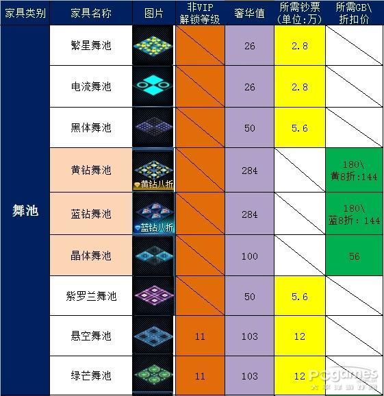 如:表中黄金舞池购买等级为23级,如果是VIP1,则自行降级等级3级,解锁等级 = 23 - 3 = 20级。