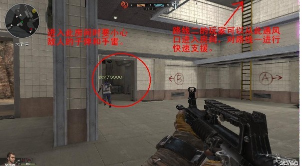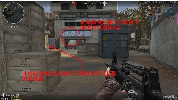 路线三:从庭院进攻,大概走到下图的位置就会与守卫者发生交火,如果能顺利突破,那么左手边便是通往A点的大门。另外,图中红圈处小房间旁边有一个小门,进去后是通往地下的隧道,这条隧道通往B点,途中会经过与B点相邻的一个房间。B点与其相邻房间之间有通风道连接,这个通风道除了可以在两个房间之间来回移动外,还有两个安全梯,安全梯通往A点两个通风口的出口。