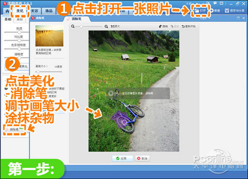 1、在“美图秀秀”软件下打开一张待处理的风景照片,进入“美化”菜单下点击“消除笔”,调节画笔的大小,涂抹杂物,只需等待几秒即可去除杂物。