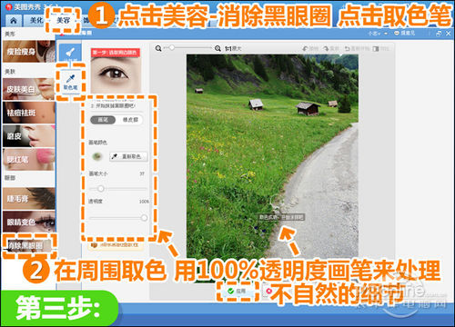 3、然后进入“美容”菜单下,点击“消除黑眼圈”功能的“取色笔”,也就是用局部图章功能来处理消除笔后一些不自然的细节部分,比如这里的路面和草丛连接处,可以用画笔在周围取色,调至100%透明度的画笔来掩盖不自然的地方。
