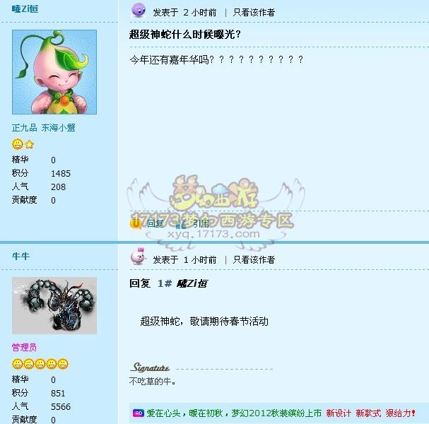 今天有玩家在论坛发帖询问新神兽的事,结果策划牛牛现身解答“超级神蛇春节后放出”。