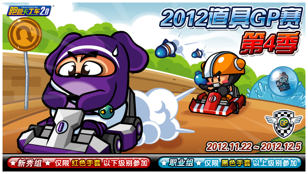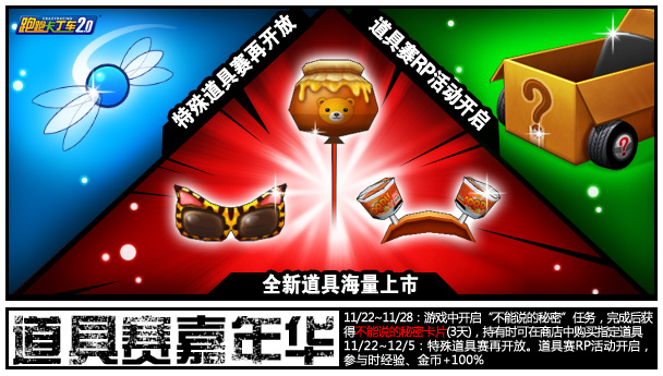 除了全新诞生的道具之外,新一季的道具GP赛和RP赛也将在嘉年华期间正式开放。11月22日至12月5日是本次道具GP赛的比赛时间。这次GP赛的奖励十分丰富,各大区1~3名将会获得贵族鸡Z7+(无限制);各大区4~10名获得黑猩猩Z7+(无限制),而各大区11~100名则可以获得道具换位卡(500个)+道具变更卡(500个)。所有GP值2200以上的玩家都可获得粒子激活器奖励!各大区更有幸运玩家可以获得IDSL游戏机,遥控赛车等珍贵奖品哦!