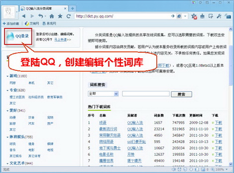 在QQ输入法主界面上点击右键,在“属性设置”的“词库管理”中点击“更多分类词库下载”链接,或者直接在浏览器中输入网址(http://dict.py.qq.com/),即可进入QQ拼音的“分类词库”页面。QQ输入法为用户提供了包括游戏、专业、体育娱乐、文化艺术等7157种不同类型的词库,而且词库的种类在不断增加。未登录的用户,可以免费下载使用QQ的分类词汇;而登录用户不仅可以下载词库,还可以创建、编辑自己独具个性的词库。(图4)