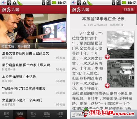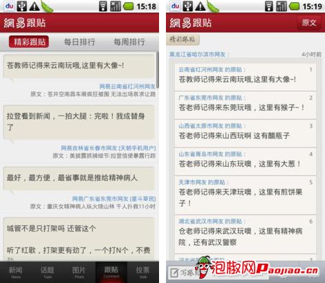 网易手机新闻客户端延续其门户网站的风格,将热门新闻资讯做为一个话题来讨论,门户站的跟贴风格也转移到了手机上,跟贴层层高楼高高挂起!