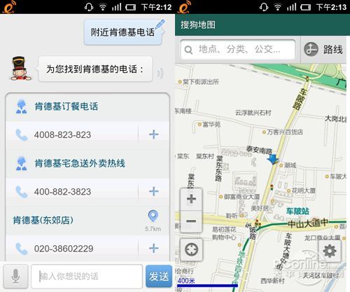 另外,小编还体验了搜狗语音助手“周边生活服务”搜索这一功能,结果真的是惊喜无限哦~小编就说了句“附近肯德基电话”,结果搜狗语音助手就很快搜索出了附加肯德基的订餐电话、外卖热线还有肯德基的具体地址。对于在外出行的人来说,这一功能真的非常的实用哦~