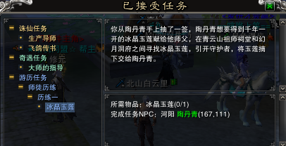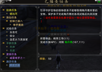 首先师傅组队到陶丹青那里接任务,接完任务后师傅只有一个任务,而徒弟的任务是要分四步来做的,其中2-4步是固定的。第一步随机,为避水珠、避火珠或者冰晶玉莲。