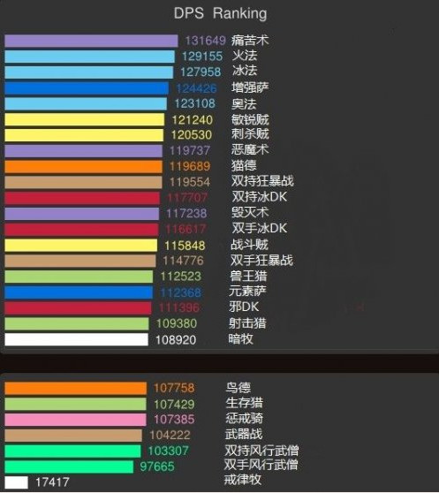 猎人和鸟德终于摆脱了垫底的命运,而这一位置也交给了武器战和风行武僧,看来暴雪是刻意为了避免当年WLK时三系DK称霸再度重现。