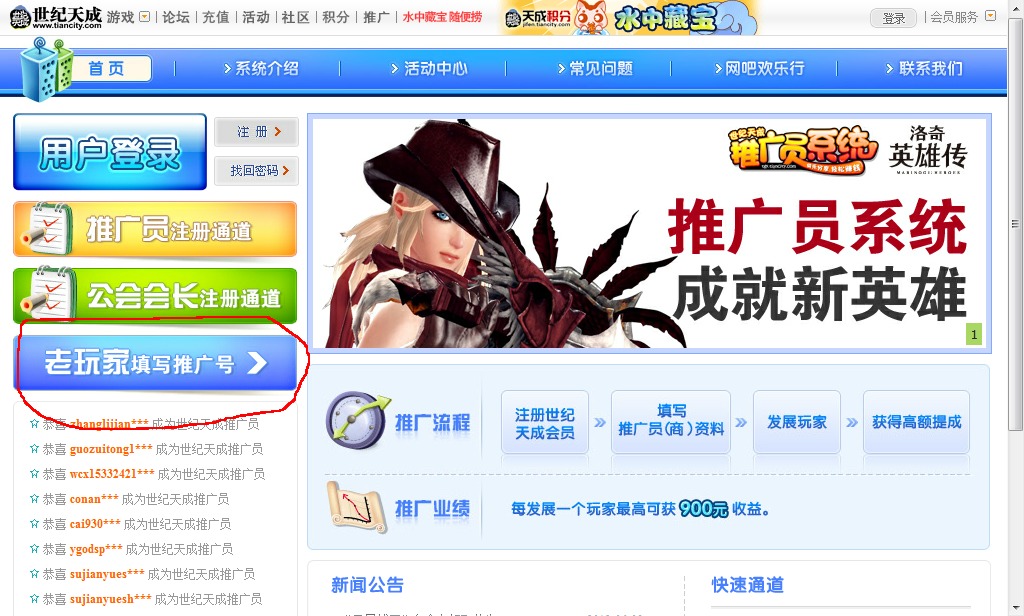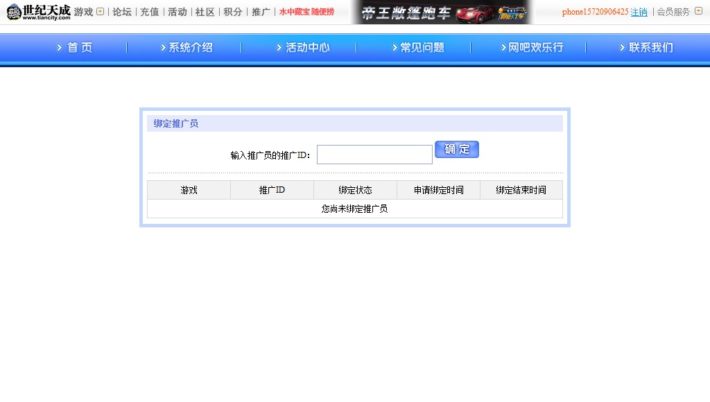 注意:当你的账号填写推广员ID后,3个月内进行充值,推广员ID账号中将获得由世纪天成发放的3%提成。绑定推广员ID24小时后,请登录此地址http://pay.tiancity.com/webcoupon/index2.html后点击此处