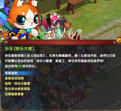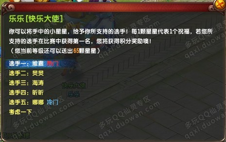 比赛开始后,玩家可以给自己喜爱的选手进行祝福,每次祝福花费一个道具快乐小星星,如果比赛结束,如果自己祝福的选手换得胜利,那么玩家可以获得快乐积分,快乐积分可用于在快乐大使处兑换各种珍惜道具。