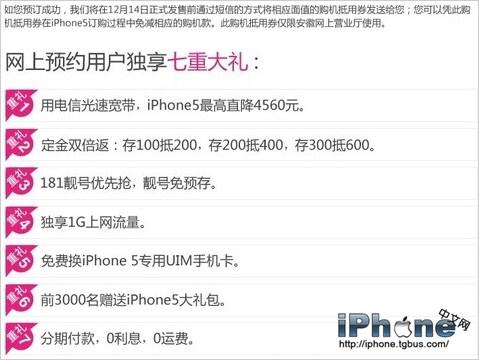 最近,联通打出了“0元登记无需押金”的预约模式来强调与电信版的不同。而这次电信也针对iPhone5做出了网上预约七重大礼的优惠模式,定金双倍返相当有吸引力,还能独享1G上网流量,对于用户而言是个小的福音。