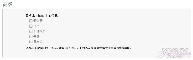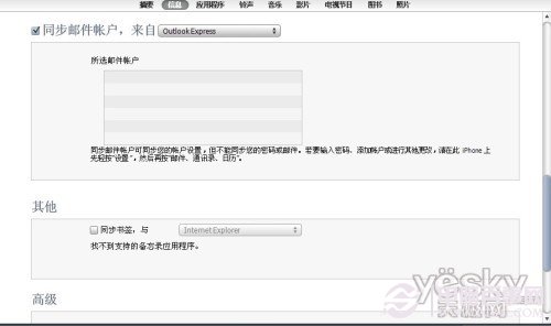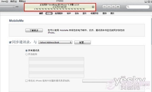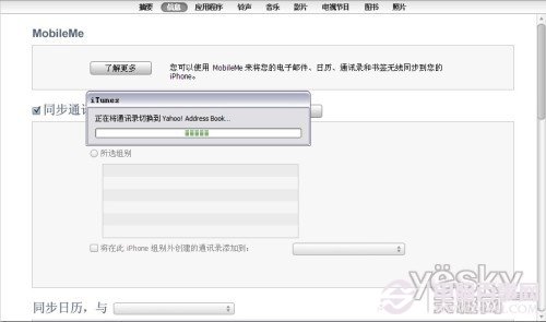 1、iPhone连接上iTunes后,点击设备下的iPhone图标,找到下面通讯录,在同步通讯录前的复选框打上勾,后面选择要备份的地方(以Yahoo为例),选择后弹出下面的对话框。