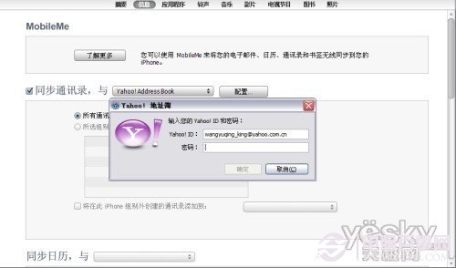 输入你的的帐号和密码,点确定,iTunes便会将通讯录备份到Yahoo的通讯录里。这时,你可以登陆到邮箱里,点通讯录,便会看到从iPhone备份出来的通讯录。