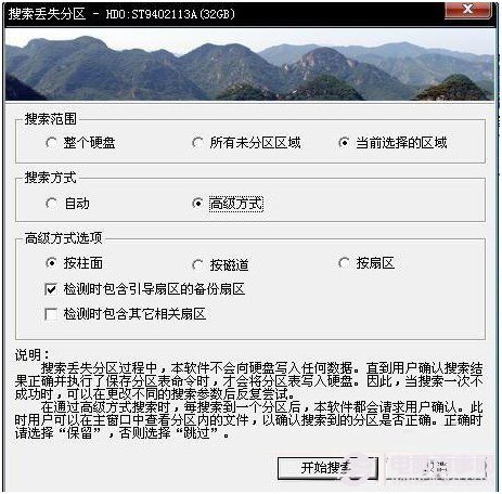 1、点击左侧“分区、目录层次图”中的硬盘条目,或硬盘内的任一分区条目,点击“硬盘 - 搜索已丢失分区(重建分区表)”菜单项,程序弹出“搜索分区”对话框,设置好选择搜索参数,点击“开始搜索”按钮即开始搜索分区及里面的数据文件了。