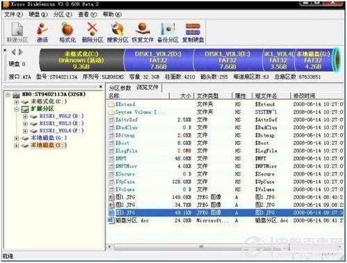 2、搜索完成后,程序弹出提示,搜索完成后,单击“硬盘”菜单项,选择“保存分区表”,这时候,丢失的分区即可识别及访问,单击分区,在右侧列表中就可以看到丢失的文件了。