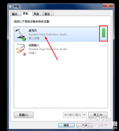 在录音设备即录制标签页中,显示了系统的麦克风,其中右边的绿色的部分是显示音量的位置,如果你对着麦克风喊一下,右边的绿色的长条就会变高,你可以根据绿色方块的高矮来判定音量的大小。