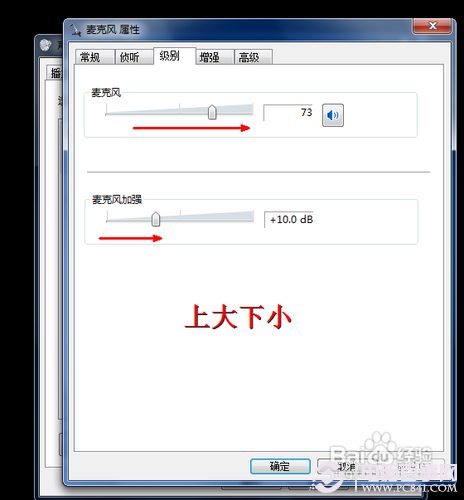 在级别标签下面,提供了两个调节选项,一个是麦克风的基本音量调节,下面那一个是音量加强的调节,它们的区别就是,调节上面的基本调节,可以最大程序的保证音质,但音量即使调整到最大也不算大,而调节下面的那个,则可以将声音轻易地调整到很大,但是同时也会出现杂音。所以,原则是上面调节得大一些,下面的只调到增加10分贝就可以了。