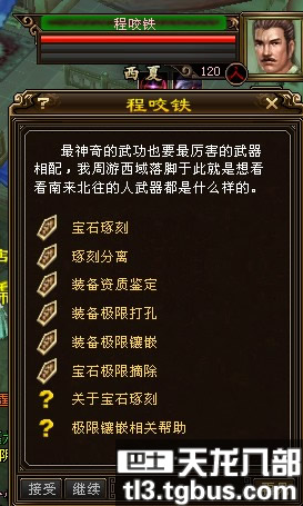 游戏中,你会发现。楼兰极限打孔、镶嵌的NPC陈咬铁同学的选项中,多了两个特殊的选项:宝石琢刻、琢刻分离。