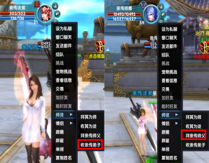 建立亲传师徒关系的操作非常简单,如果您的附近有您想要收的亲传弟子或想要拜的亲传师父,可以通过右键点击该玩家头像进行收徒或拜师。在这之前,双方不需要建立师徒关系。