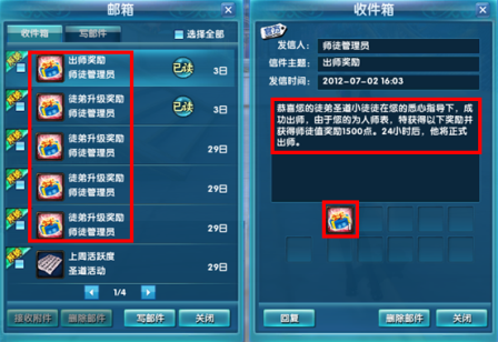 师父传承给亲传弟子的祖传装备会通过邮箱发送到亲传弟子手中,既方便、又快捷。