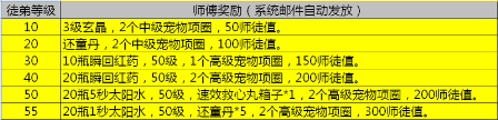 当亲传徒弟升级时亲传师父同样会获得徒弟的升级奖励;同样,当亲传徒弟出师时师父和徒弟都会获得最终的出师大奖!