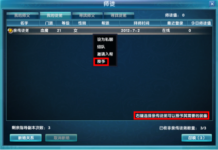 注意:一名玩家一生只可以有1位亲传师父;而一名玩家一生可以有多位亲传徒弟,但同时只能有1位亲传徒弟。