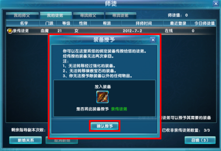 师父将自己的装备传承给亲传徒弟的操作也是十分简单的,只需在师徒界面(快捷键L)的我的徒弟界面中右键点击亲传徒弟,选择按钮“授予”。这时会弹出师徒传承界面,将所需传承的装备放入装备栏中,点击按钮“确认”即可将装备传承给自己的亲传徒弟!